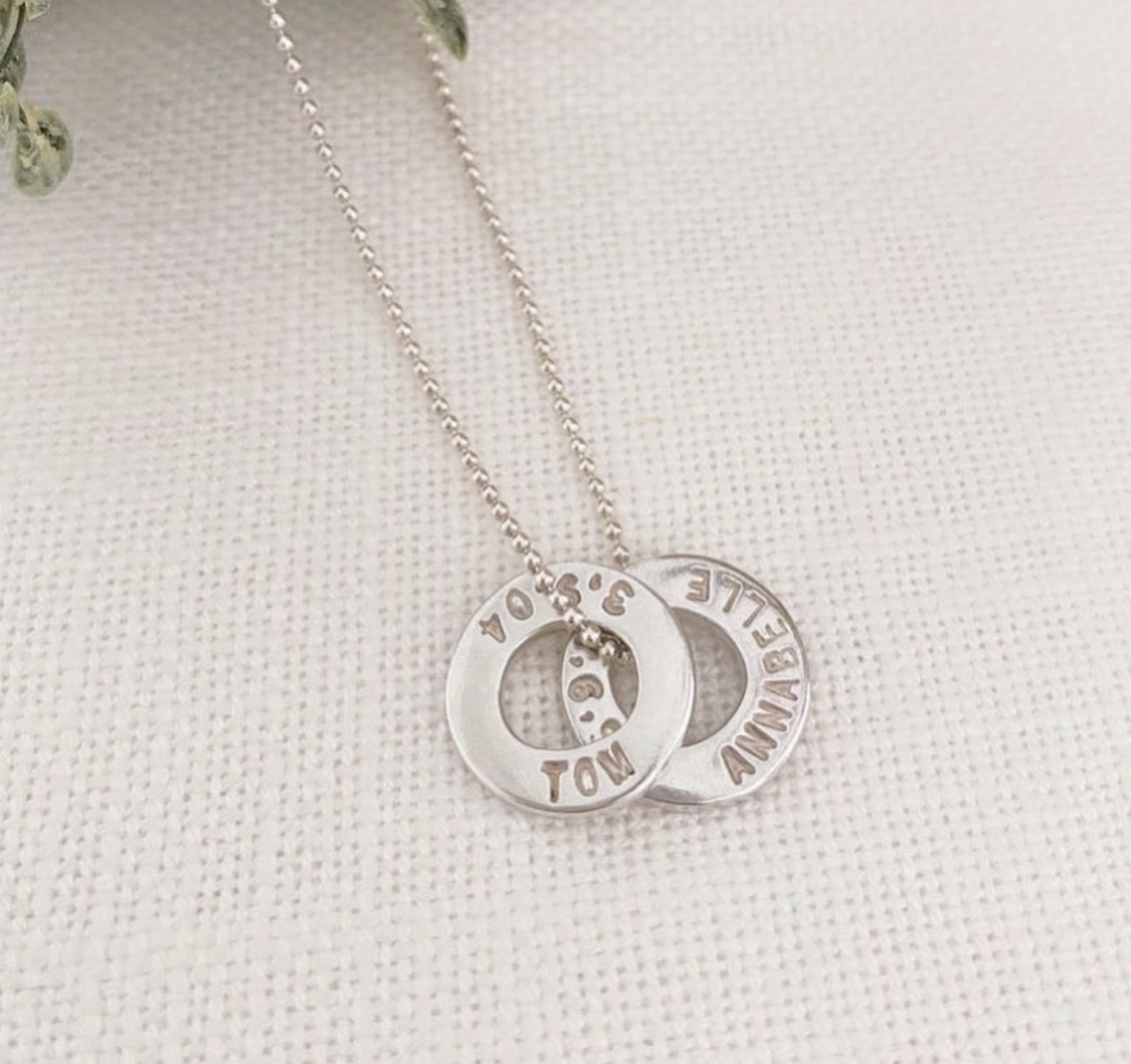 This gorgeous name disc with your personalised name is looped onto your choice of silver chain.