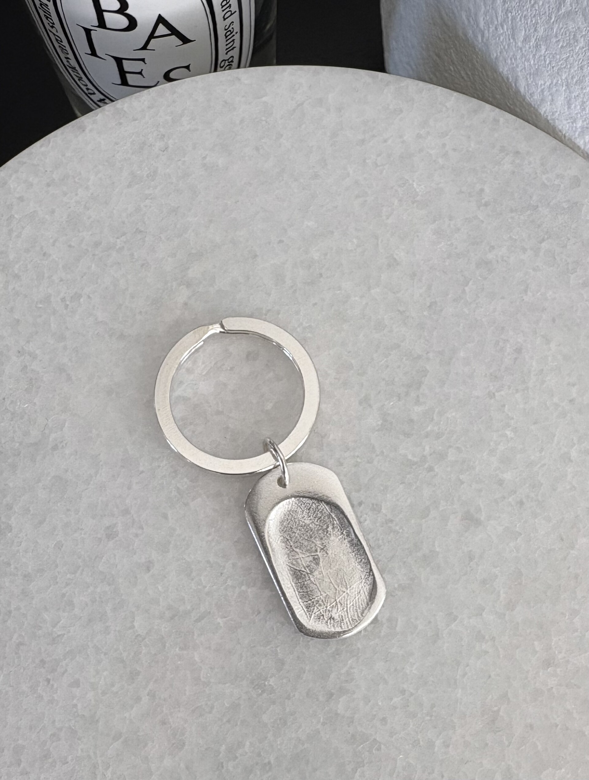 Create a a unique Key Ring with this gorgeous pure silver fingerprint dog tag shaped charm on a sterling silver key ring.